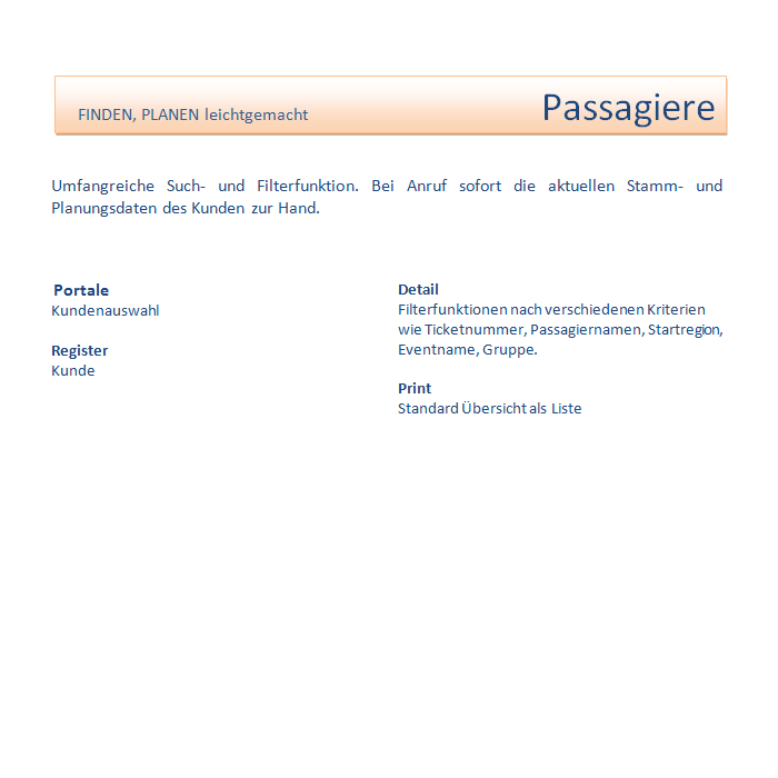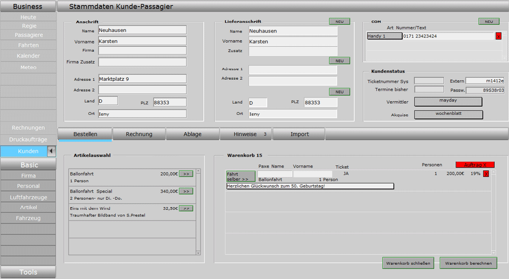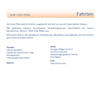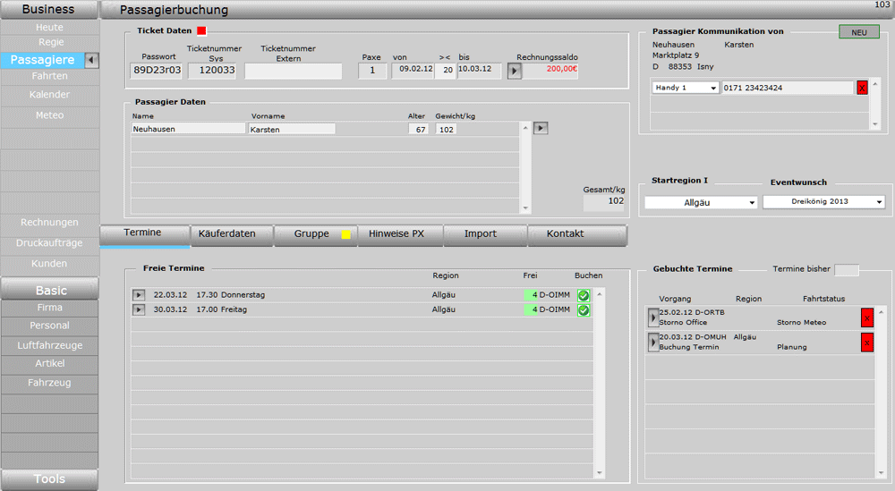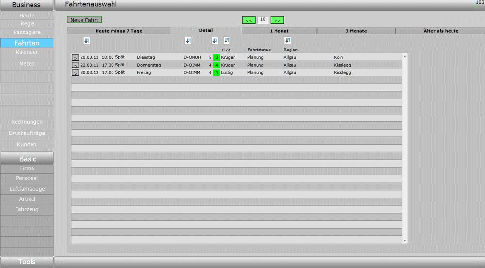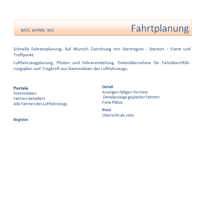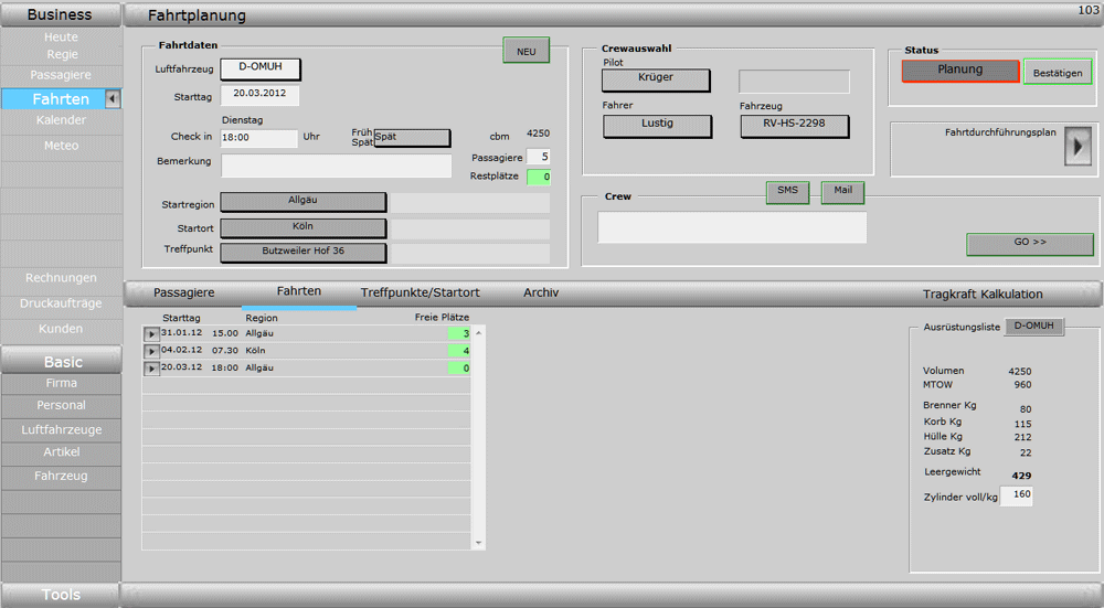 Übersichtliche Führung aller notwendigen Stammdaten. Ob Firma-Luftfahrzeug-Personal-Fahrzeug. Klare Darstellung freier Korbplätze. Automatische Erstellung des Fahrtdurchführungsplans.